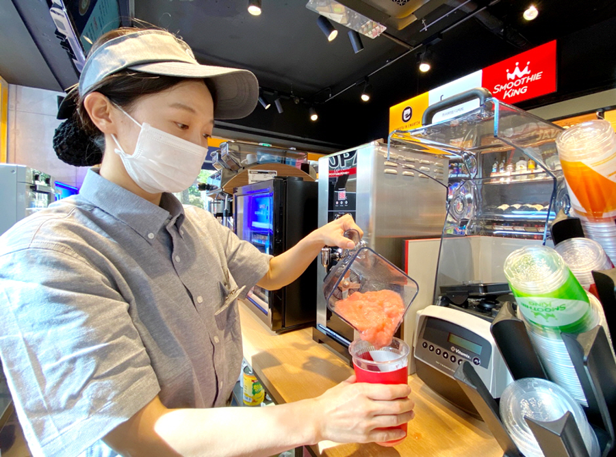 이마트24 X 스무디킹 가맹 모델은 편의점 내 약 3~4평의 카운터 공간에 스무디킹을 추가로 창업하는 방식으로, 일반 스무디킹 매장을 개설하는 것과 비교해 창업 비용을 대폭 낮출 수 있다. 하루에 스무디 5~10잔 판매 시 수익이 발생하는 구조라 추가 창업에 대한 경영주의 부담도 낮은 편이다. 무엇보다 편의점에서 4900원~6900원의 스무디를 전문적으로 판매함으로써 신규 고객 유입, 객단가 상승 등 추가 수익 창출의 가능성을 높일 수 있다. 실제로 스무디가 이마트24의 차별화된 음료로 자리잡으면서 가맹점 80곳 중 하루 평균 스무디 30잔 이상을 판매하는 곳도 생겼다.