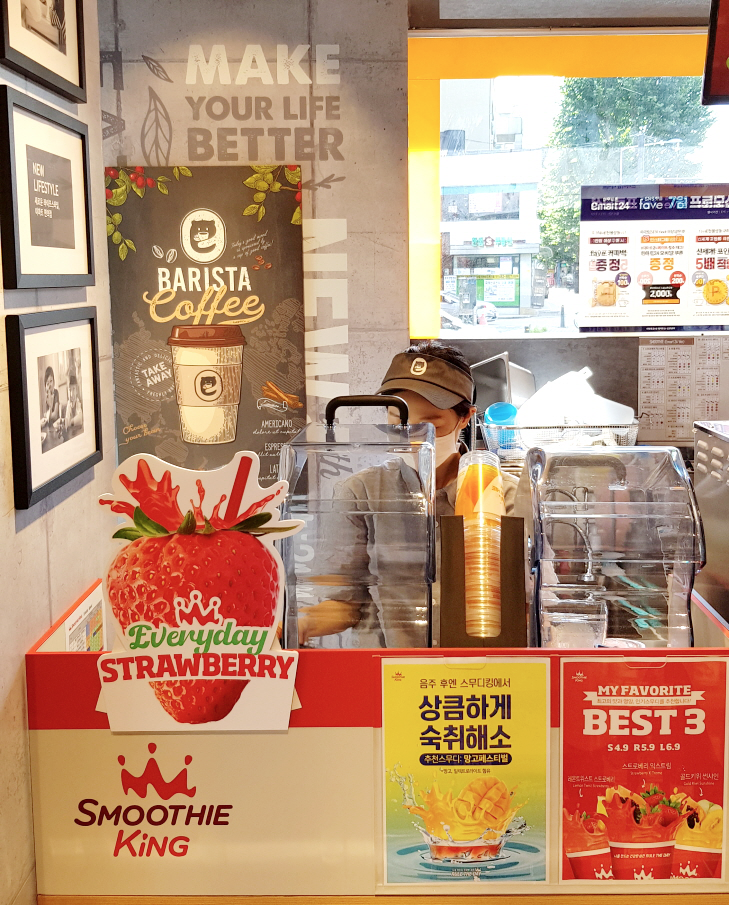 이마트24 X 스무디킹 매장이 6월 말 100호점을 돌파하며 순항 중이다. 7월 10일 기준 이마트24 X 스무디킹 매장 수는 총 105점이다. 올해 3월 초 20여개 직영점을 대상으로 테스트를 마치고 이마트24 X 스무디킹 가맹모델을 본격 확대한 이후 가맹점 80개가 늘어났다. 평일(영업일) 기준 매일 1개씩 신규 가맹점이 문을 연 셈이다. 이마트24 X 스무디킹 매장이 100호점을 돌파할 수 있었던 것은 창업 비용 대비 높은 운영 효율을 기대할 수 있다는 점이 가맹점의 호응을 이끌어냈기 때문이다.
