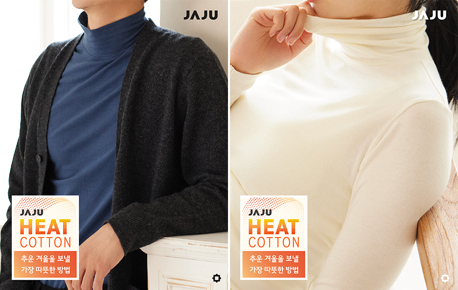 자주는 발열 내의 가 큰 인기를 끌자 프리미엄 소재를 사용한 자주 히트 코튼(JAJU HEAT COTTON) 라인도 올해 새롭게 선보였다. 천연소재 코튼을 사용해 피부에 자극이 적으며 흡습성, 통기성이 뛰어나 부드럽고 산뜻한 착용감이 특징이다. 환경친화적인 방식으로 재배한 ‘코튼 메이드 인 아프리카(CmiA)’ 인증 면화를 사용해 지속가능성에도 신경 썼다.