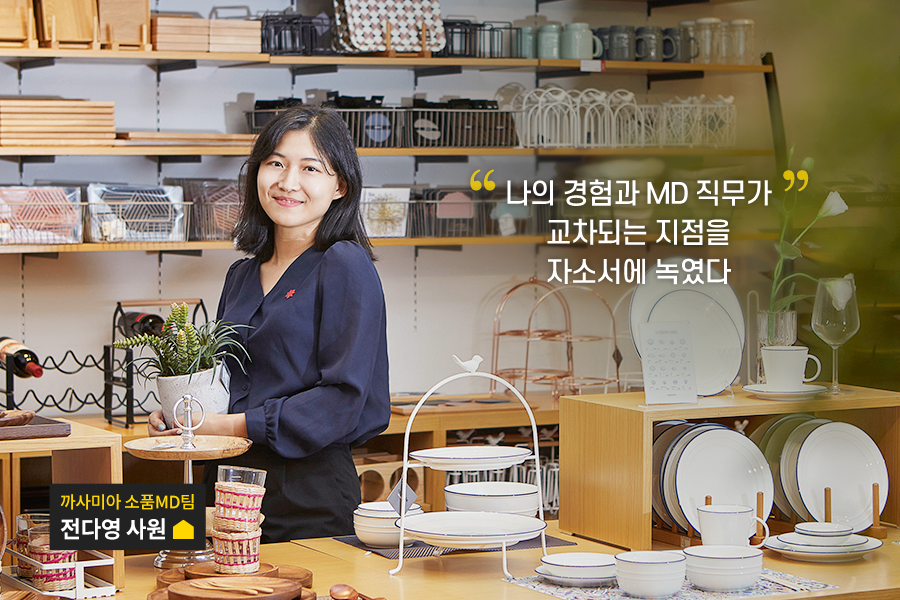 바이어로서 까사미아 소품MD팀에서 다양한 상품을 담당하고 있다. 까사미아는 글라스류, 식기류, 침구부터 화병, 조명, 수납용품 등 많은 소품 카테고리를 보유하고 있다.