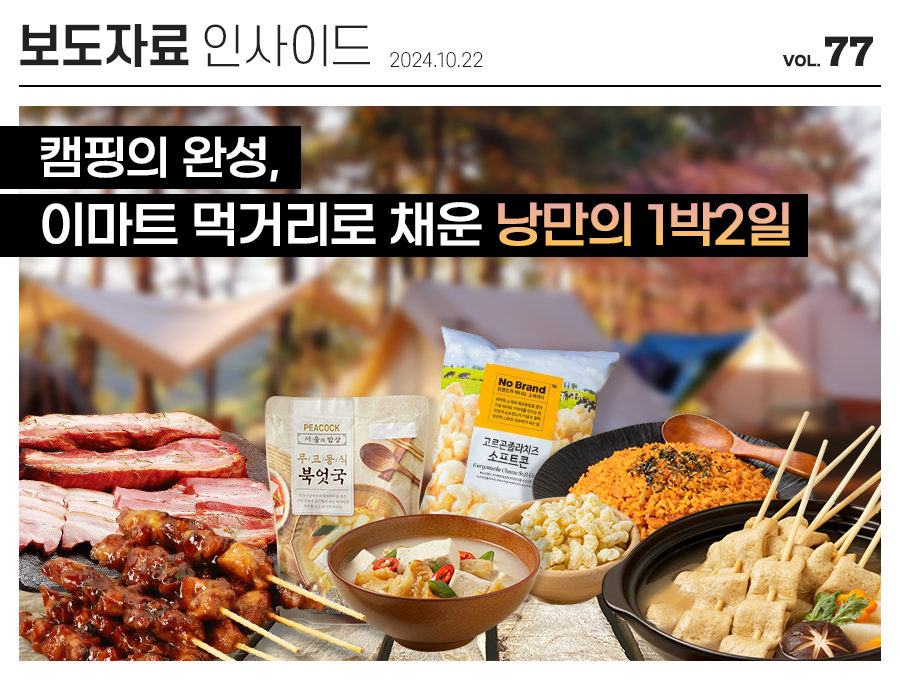 이마트는 캠퍼들의 먹거리를 책임지는 든든한 캠핑 메이트로서, 끊임없이 다양한 상품들을 선보일 예정이다. 가을이 무르익는 11월, 키친델리는 그동안 캠핑장에서는 쉽게 접하기 어려웠던 한우 소머리 수육과 마라 떡볶이를 출시할 예정이다. 피코크는 베스트셀러 로코스 바비큐폭립을 이을 새로운 숯불양념바비큐 상품을 준비 중이다. 그 외 얼큰버섯샤브샤브, 우삼겹즉석떡볶이, 유부주머니전골 등 캠핑과 어울리는 신메뉴를 선보일 계획이다.