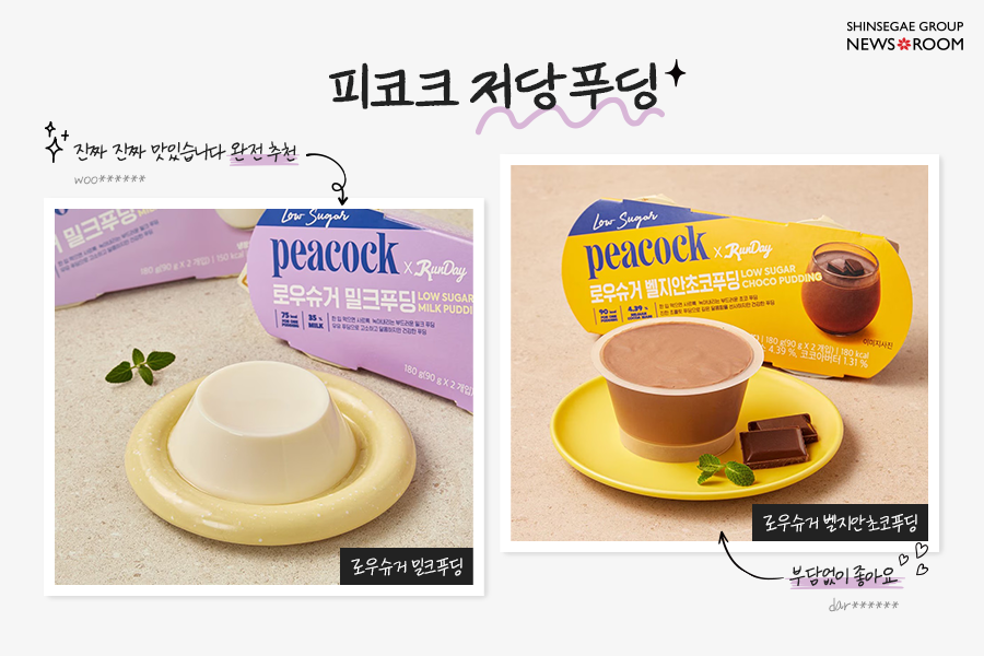 건강을 챙기고 싶지만 디저트를 포기할 수 없다면 피코크의 저당 푸딩이 좋은 타협점이 된다. 피코크 저당푸딩은 설탕대신 에리스리톨, 알룰로스, 스테비아 등 대체 감미료를 사용해 당류를 5% 미만으로 낮췄다. 밀크푸딩은 우유를 사용해 고소하고 부드러운 본연의 맛을 살렸고, 벨지안 초코푸딩은 벨기에산 초콜릿을 넣어 깊고 진한 맛이 일품이다.