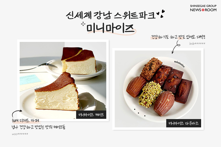 디저트의 성지, 신세계백화점 강남점 스위크 파크에서도 맛있고 건강한 디저트를 만날 수 있다. 이곳에 위치한 ‘미니마이즈(Minimize)’는 그 이름처럼 ‘불필요한 것을 덜어낸’ 건강한 디저트를 만든다. 모든 제품들은 밀가루와 글루텐 없이 쌀가루를 활용했고, 설탕 대신 GI지수가 낮은 코코넛슈가와 에리스리톨 등의 재료를 사용한다.