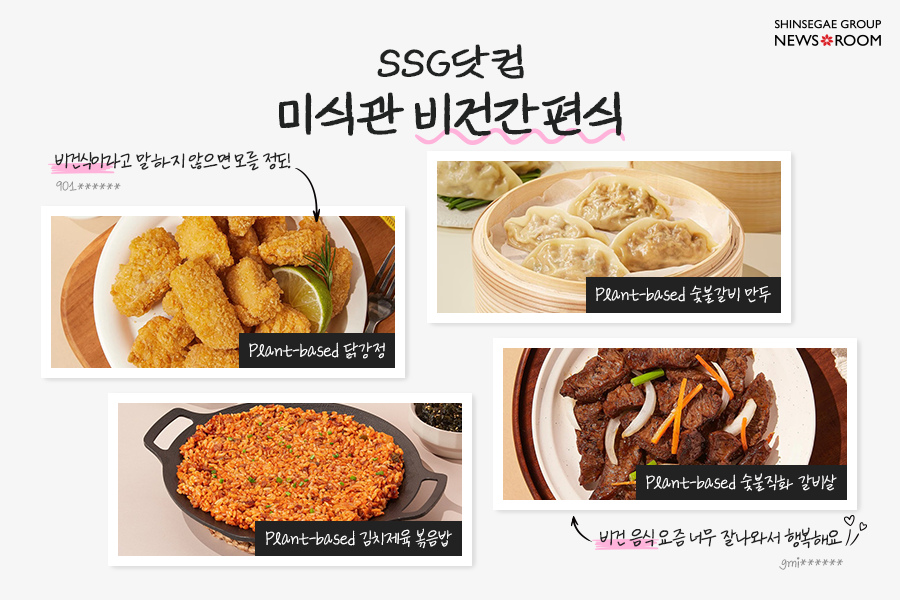 SSG닷컴 미식관은 비건 전문 브랜드 이노하스와 함께 비건 간편식 10종을 선보인다. 식물성 고기에 자체 개발한 소스를 더한 미트볼, 닭강정, 갈비만두 등 익숙한 음식을 비건식으로 재해석했다. 모든 제품은 트랜스지방, 콜레스테롤, GMO를 사용하지 않아 깔끔한 맛과 건강함을 동시에 갖췄다. 전자레인지나 에어프라이어 하나면 완성돼 바쁜 일상 속에서도 부담 없이 건강을 챙길 수 있다.
