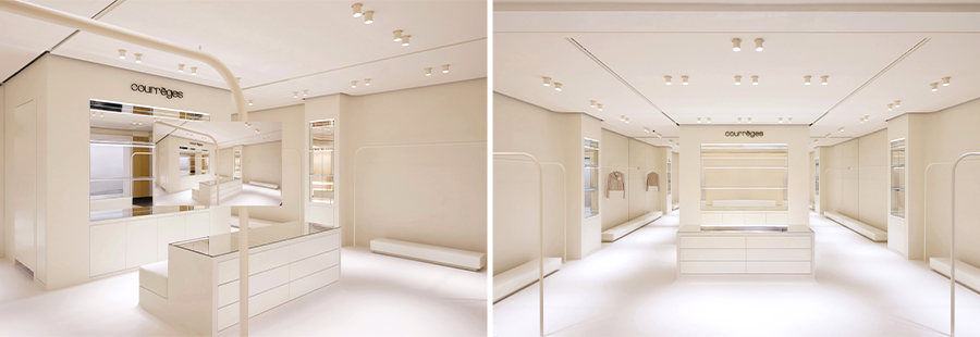 브랜드를 상징하는 색상인 ‘화이트’를 바탕으로 전반적으로 미니멀한 구조의 가구와 집기를 배치해 절제된 아름다움을 표현했다. 단순하면서도 세련된 공간 구성을 통해 꾸레쥬 특유의 디자인 철학을 시각적으로 드러냈다.