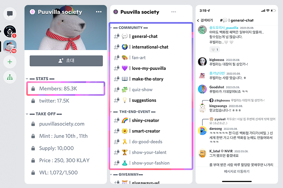미래 가치를 드러내듯 디스코드 내 푸빌라 커뮤니티에는 8만 5,300명(5월 25일 기준)의 예비 홀더들이 모였다. 국내 최대 NFT운영팀 메타콩즈 커뮤니티 멤버수인 6만 2,900명(5월 25일 기준)을 넘어선 숫자다. 커뮤니티에는 푸빌라 소사이어티의 발전과 흥행을 기대하는 이들이 넘쳐난다. 또 이들은 여러 미션을 수행하며 활동하는데, 이는 푸빌라 NFT 구매 우선권을 받을 수 있는 2차 ‘화이트리스트’에 선정될 수 있기 때문이다.