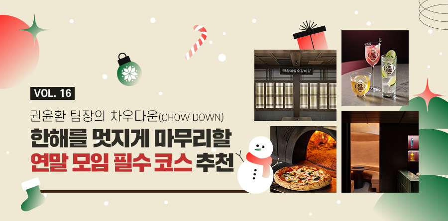 숨가쁘게 달려온 2024년, 어느덧 올해의 마지막 달력을 펼치게 되었습니다. 매년 그렇듯 이맘때면 그간 바쁘단 핑계로 오랫동안 보지 못한 얼굴들이 가장 먼저 떠오르는데요. 소중한 이들과 마음을 나누기에 더없이 좋은 12월, 아직 연말 모임 장소를 못 정하셨다면 오늘 소개해 드린 곳들이 좋은 선택지가 되어 줄 겁니다. 여러분 모두 저마다의 방식으로 한해를 멋지게 마무리하시길 바라며.. 미리 전하는 인사와 함께 글을 마칩니다. 메리 크리스마스, 해피 뉴 이어!
