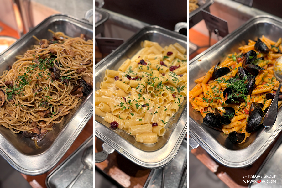 이곳에서는 점심에 뷔페를 운영하는데요. 단순히 구색을 갖추기 위한 곁다리 메뉴들은 제외하고, 더 키친 일뽀르노의 대표 메뉴들만 선별해 구성했습니다. 가짓수를 줄인 만큼, 음식 하나하나에 공들여 맛의 퀄리티를 높였죠. 특히 쫄깃한 도우에 질 좋은 생 모차렐라를 올린 피자와, 이태리 본토의 맛을 재현한 파스타류만으로도 충분히 만족스러웠는데요. 햄, 연어, 샐러드바와 티라미수까지 있기 때문에 나만의 이탈리안 코스를 구성하는 것도 재미 요소입니다.