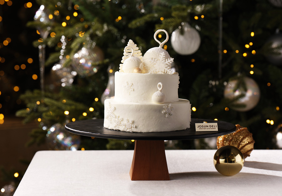 새하얀 겨울의 첫눈처럼 순백의 매력을 지닌 퍼스트 스노우 케이크(First Snow)는 레드벨벳 시트 위에 크림 치즈와 발로나 화이트 초콜릿을 마치 흰 눈밭처럼 부드럽게 장식했다. 반짝이는 금빛과 백색의 크리스마스 오너먼트를 더해 한겨울의 낭만을 케이크 한 조각에 담아냈다. 가격은 98,000원이다.