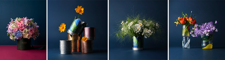 유리 공예가 양유완 작가와 함께 선보이는 화기 컬렉션은 액체 상태의 유리를 입으로 불어 모양을 만드는 ‘블로잉’ 기법을 활용해 화려하게 피어오른 형형색색의 꽃잎이 흩날리는 모습을 표현해냈다. 비정형의 모양으로 다듬어지지 않은 자연스러운 매력을 극대화한 화기는 격물공부의 플로리스트들이 디자인한 플라워가 더해져 생동감 넘치는 작품이 된다.