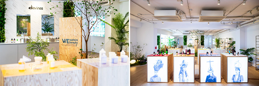 다비네스 팝업 매장은 다양한 인증샷을 남길 수 있는 포토존, 브랜드의 전체 라인을 모두 만나볼 수 있는 디스플레이존, 제품을 직접 사용해볼 수 있는 체험존, ‘지속 가능한 아름다움’ 캠페인존 등으로 구성됐다 대부분의 집기는 브랜드의 철학을 반영해 재활용 소재를 적극 활용했으며, 다 쓴 다비네스 공병을 활용한 화분으로 꾸며진 미니 가든 등 자연을 모티브로 한 소재들을 곳곳에서 만나볼 수 있다.