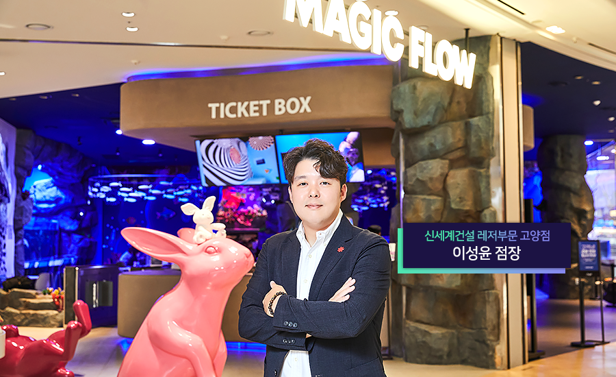 안녕하세요. 신세계건설 레저부문 고양점 점장 이성윤입니다. 스타필드 고양점의 대표적인 레저시설인 ‘아쿠아필드’를 비롯해 ‘매직플로우’, 스크린 골프장 ‘데이골프’를 담당하고 있습니다. 남녀노소 누구나 즐길 수 있는 여가 문화 생활을 제공한다는 마음으로 자부심을 가지고 업무에 임하고 있습니다.