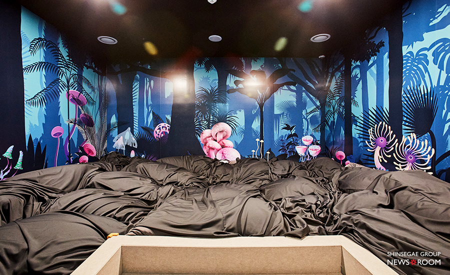다음 전시관의 문을 열자 토끼 굴을 닮은 어두운 공간이 등장했다. 폭신한 쿠션으로 가득 차 있어 전시를 둘러보며 지친 몸을 휴식하기에 안성맞춤이었다. 이성윤 점장은 “이곳에서는 편안히 누워서 온몸으로 촉각을 즐길 수 있다. 위를 걸으면 폭신한 모래 위를 걷는 듯한 느낌을 주도록 기획했다”고 공간을 설명했다.