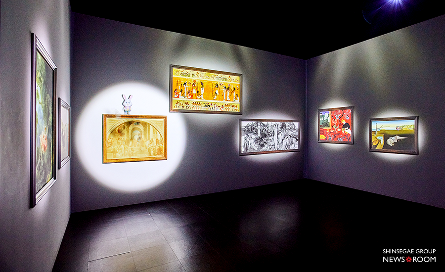 첫 번째 전시장에 들어서자 개구쟁이 토끼가 가장 먼저 반긴다. 토끼는 이리저리 뛰어다니며, 전시된 미켈란젤로, 밀레 등의 명화에 물감을 뿌리기 시작한다. 들어온 모두가 토끼의 움직임과 물감의 색채에 시선을 뺏긴다. 이성윤 점장은 “첫 순간부터 관객들의 호기심을 자극하고자 했다. ‘예술이 어렵다고? 누구의 그림인지는 중요하지 않아, 네가 재미있다면 그게 예술인 거야!’라는 메시지를 느낄 수 있는 공간이다”고 말했다. 토끼와 명화가 살아 숨 쉬는 듯한 역동적인 애니메이션을 감상하며 다음 공간으로 향했다.