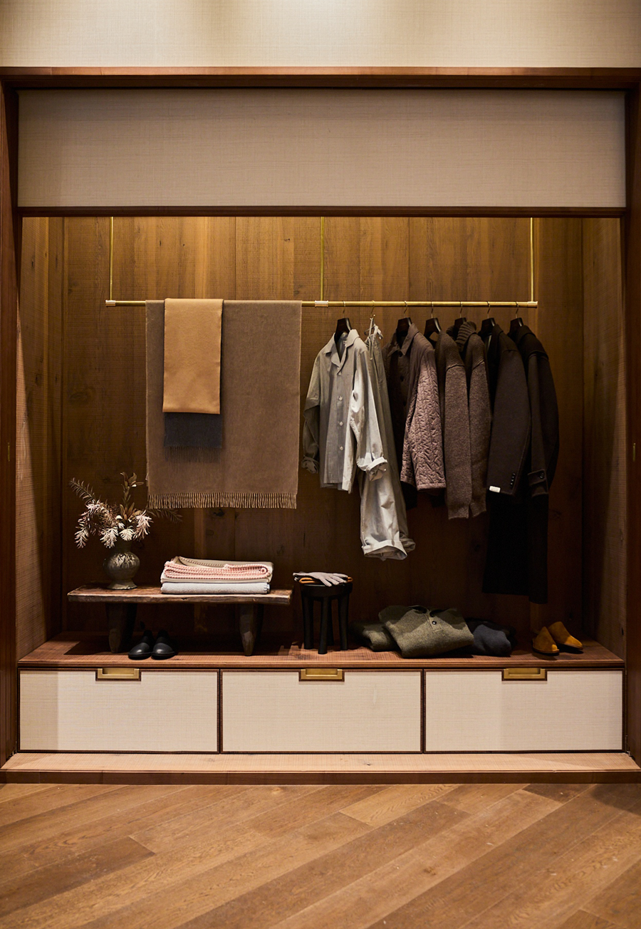 인테리어는 브라운과 우드톤을 기반으로 한국 전통 주택의 구조와 감성을 담았다. 매장 전면 유리창에는 한국 공예 작가의 조각보 패치워크 작품을 설치하고 내부에는 장, 궤, 뒤주, 관복함 등 한국의 전통 가구와 빈티지 소품을 배치해 집의 주인인 맨온더분 페르소나의 세련된 취향을 드러냈다.