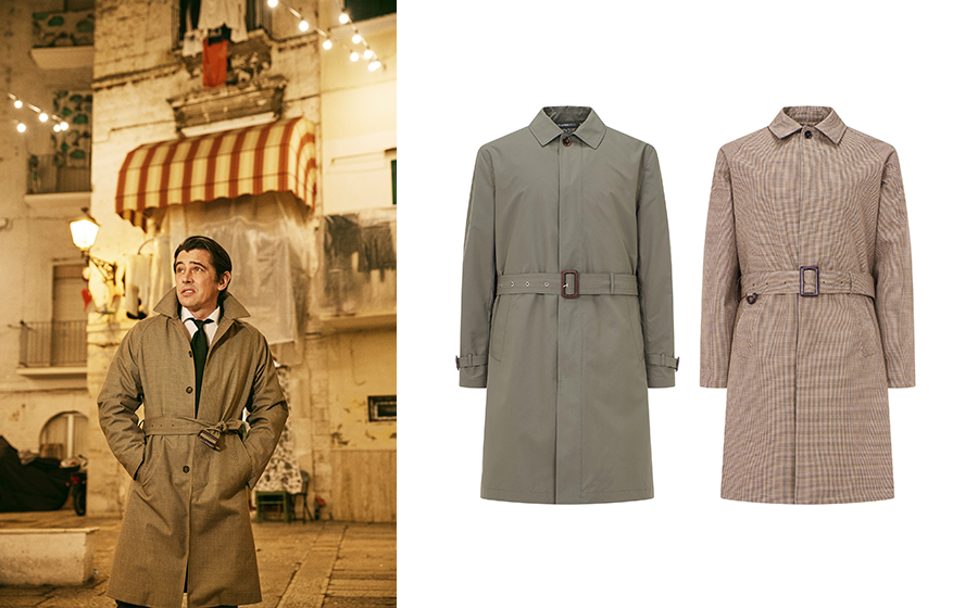 세미 오버사이즈 트렌치코트는 전체에 작은 하운즈투스 체크 패턴이 적용돼 그 자체로 특색을 드러내며 여유로운 형태와 래글런(어깨를 따로 달지 않고 깃에서 소매로 바로 이어지게 되어 있는 디자인) 소매가 툭 걸치는 것만으로 멋스러운 느낌을 준다.