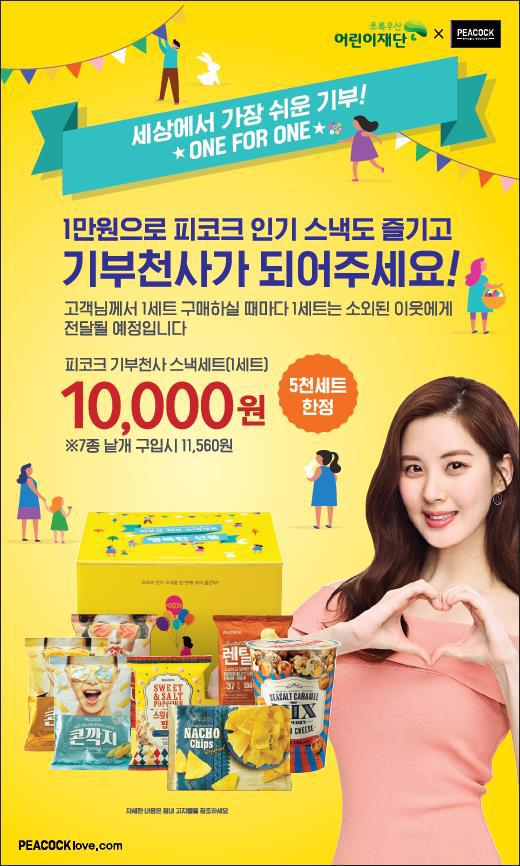 이마트는 5월 한 달간 초록우산 어린이재단과 손잡고 ‘피코크 스낵 선물세트’ 1+1 기부 캠페인을 펼친다고 밝혔다.