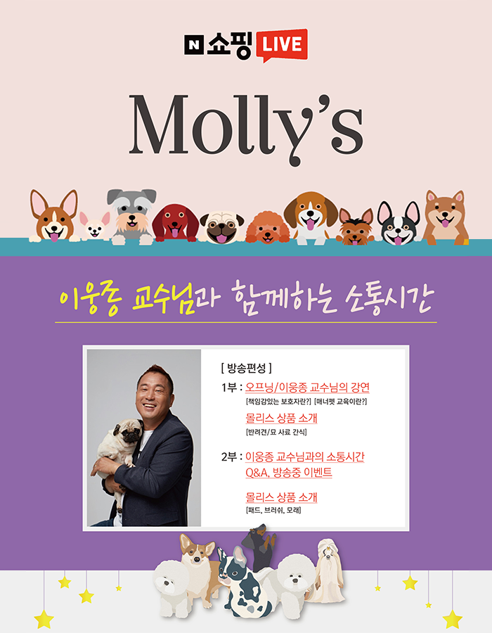 몰리스는 라이브커머스 기념 사전 이벤트로 이웅종 교수에게 반려동물 관련 질문을 남긴 시청자 중 추첨을 통해 몰리스 상품을 증정한다. 또, 몰리스 스마트스토어를 찜하거나 ‘방송 알림 받기’를 설정한 고객에게는 몰리스 할인 쿠폰을 증정한다.