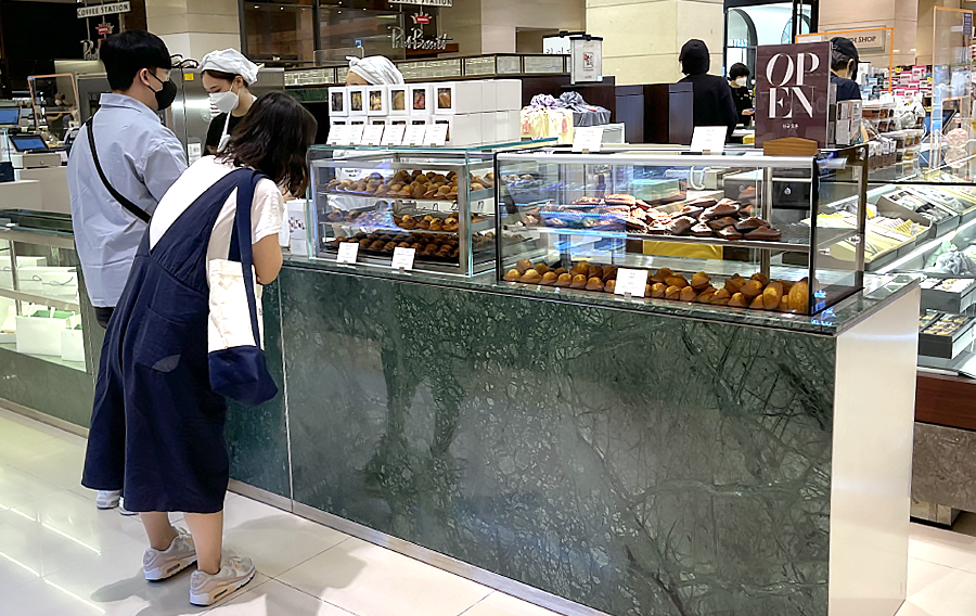 먼저 국내 최고 프랑스 디저트 전문점인 ‘메종엠오’를 지난 18일 신규 오픈했다. 방배동에 본점이 있는 메종엠오는 오픈 전부터 줄 서서 먹는 곳으로 유명하다. 인기 메뉴인 마들렌은 고급스러운 버터 향과 함께 겉은 바삭하고 속은 부드러운 게 특징이다. 대표 상품으로는 앙 휘낭시에 3500원, 마들렌 글라쎄 3100원, 사브레바니유 5300원 등이 있다.