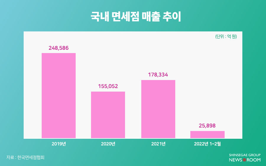 지난 2년은 국내 면세업계의 암흑기었다해도 과언이 아니다. 코로나19 팬데믹 여파로 하늘길이 막히며 직격탄을 맞은 것이다. 한국면세점협회에 따르면 2019년 24조 8,586억 원으로 정점을 찍었던 면세점 매출액은 코로나19가 닥친 2020년에 15조 5,052억 원으로 급감했다. 2021년 소폭 회복세를 보였으나 코로나 이전 수준에는 크게 못 미쳤다.
