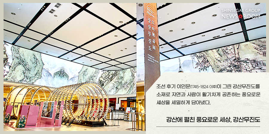 한국의 문화유산을 디지털로 다채롭게 구현한 영상이 약 20분간 파노라마로 펼쳐졌다. 이는 국립중앙박물관이 소장한 문화유산을 기반으로 제작한 디지털 실감 콘텐츠로, 신세계면세점 명동점의 미디어파사드에 맞춰 재구성된 버전이다. 반가사유상, 나전칠기함, 달항아리 등 우리 문화재에 담긴 고유의 색과 재질을 미디어아트로 담아낸 ‘형형색색의 시간, 빛나다’와 정조의 화려한 화성행차를 담은 ‘왕의 행차, 백성과 함께 하다’, 그리고 조선 후기 금강산의 실경산수를 소재로 한 ‘금강산에 오르다’ 등 총 7개의 작품을 ‘이상향’이라는 주제로 엮었다.