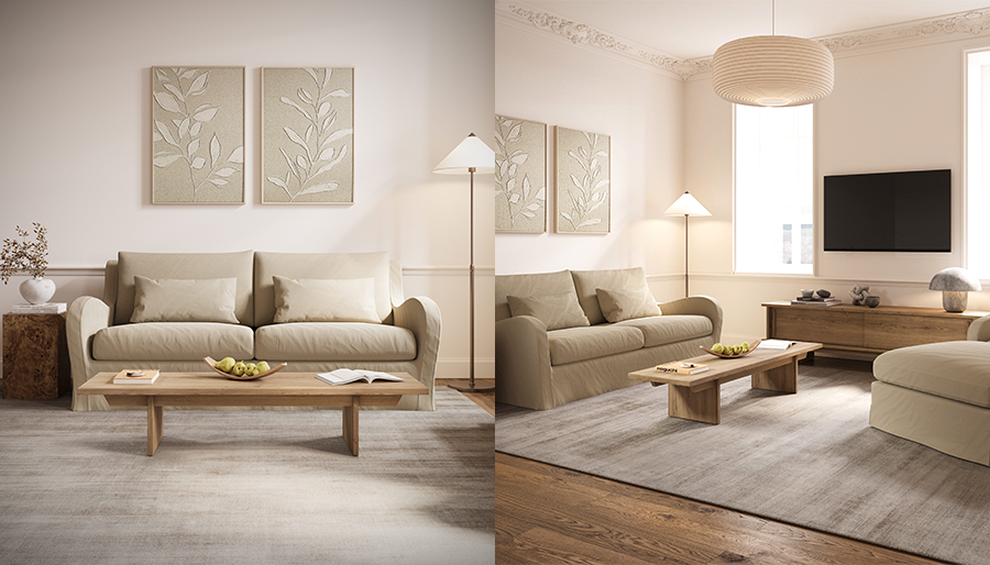 패브릭 소재의 편안한 분위기를 극대화하는 심플한 실루엣과 겉 커버를 프레임에 씌워 입히는 방식 등 엠마 베드의 특징적 요소를 적용해 두 가구를 함께 연출 시 조화롭도록 기획했다.