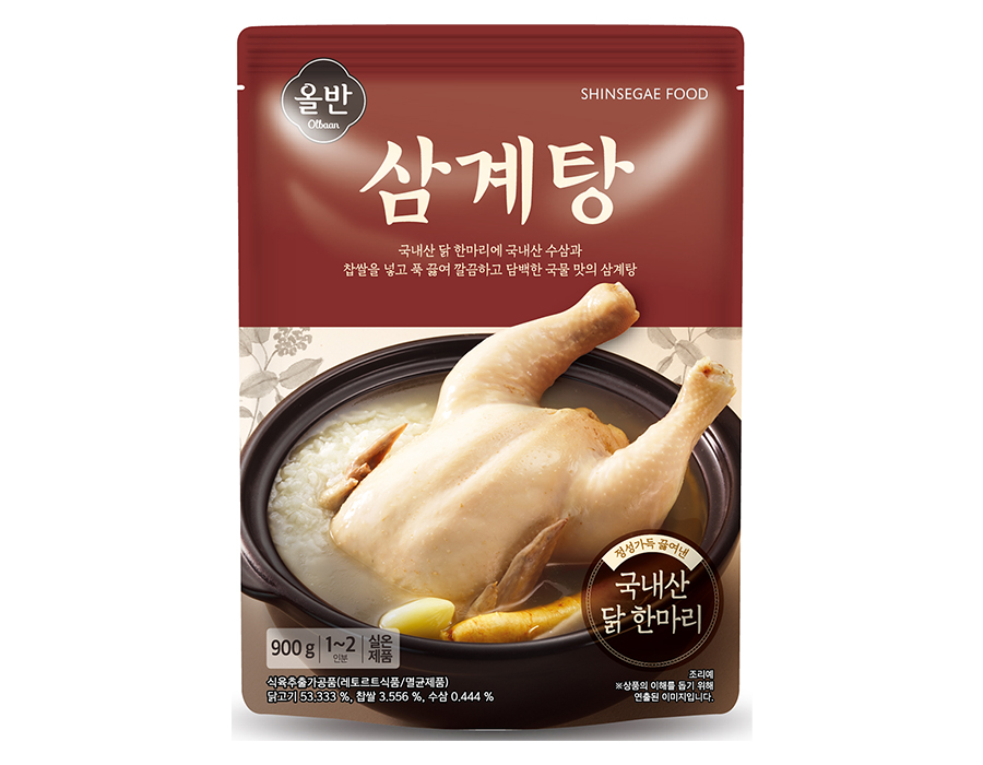 한편 신세계푸드의 ‘올반 삼계탕’은 엄선한 국내산 닭 한마리에 국내산 인삼과 찹쌀을 넣어 푹 끓이고, 기름기와 불순물을 걸러내 깔끔하고 담백한 국물 맛이 특징이다. 또한 찹쌀, 인삼, 마늘, 양파, 생강 등 5가지 국내산 농산물을 사용해 더욱 건강하게 즐길 수 있는 제품이다. 상온 간편식으로 만들어져 온라인 주문 및 장기간 실온보관이 가능하고, 끓는 물에 포장된 상태로 15분만 가열하면 돼 조리도 간편하다.