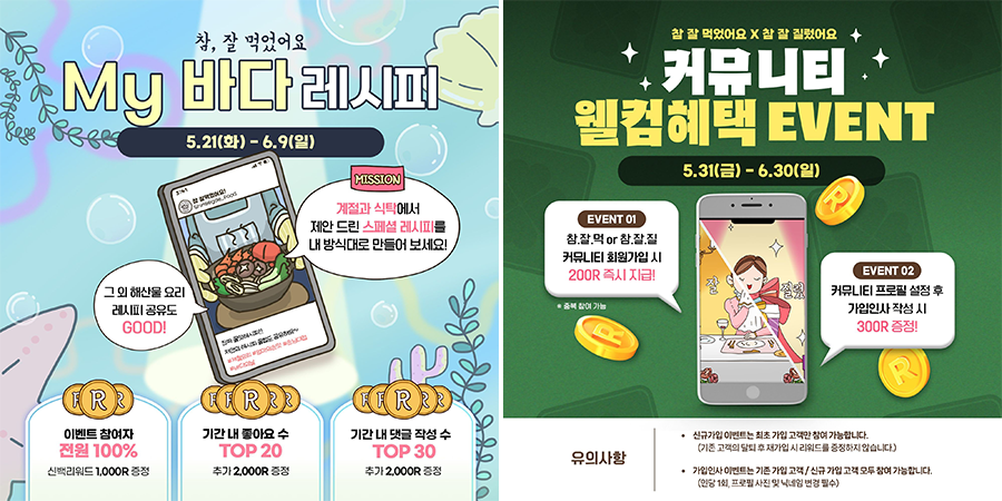 먼저 ‘참잘먹었어요’ 커뮤니티에서는 ‘계절과 식탁 X 제주 바다의 맛 레시피’ 행사를 6월 9일까지 진행하고 있다. 제주 특산물을 활용한 추천 레시피 혹은 자신만의 레시피를 만들어 사진·영상을 첨부해 커뮤니티에 공유하는 이벤트이다.