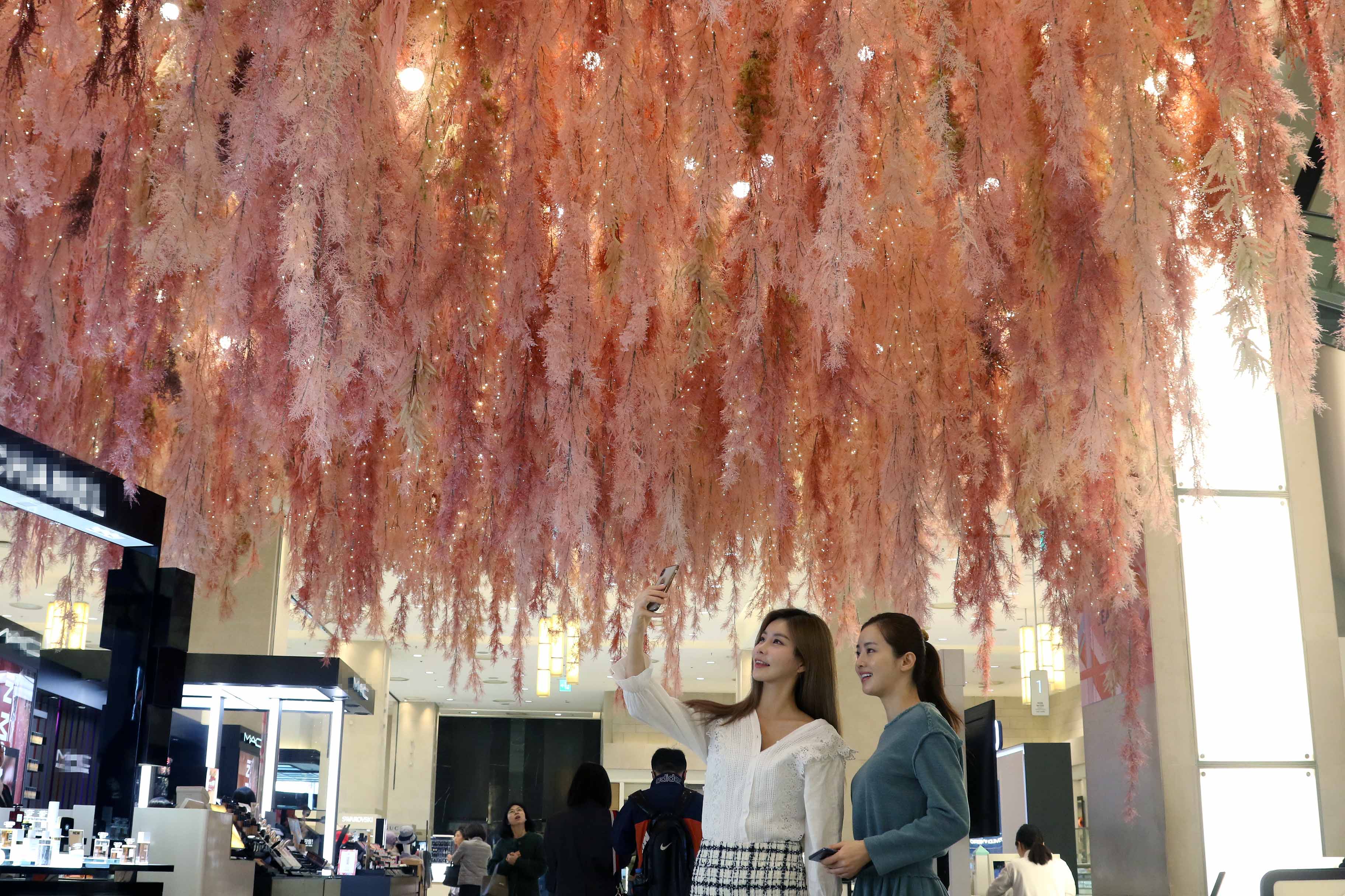 먼저 신세계백화점 본점 1층에는 길이 19m의 온실 프레임에 올 봄 트렌드 컬러인 ‘리빙 코랄’ 컬러의 꽃으로 꾸몄다.