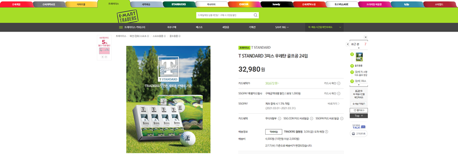 17일, 트레이더스는 ‘티 스탠다드 우레탄 3피스 골프공'(이하, 티 스탠다드 골프공)을 전국 20개 트레이더스 매장과 SSG닷컴을 통해 온·오프라인 판매를 본격 시작했다. 발매 가격은 24개에 32,980원으로 우레탄 커버 3피스 골프공 중 국내 최저가 수준이다. ‘티 스탠다드(T STANDARD)’는 기존 자체 브랜드 ‘트레이더스 딜(TRADERS DEAL)’을 이을 트레이더스의 차세대 자체 브랜드, 즉 PL 상품이다. ‘티 스탠다드’는 ‘트레이더스가 만든 상품 선택의 기준’이라는 의미를 갖는다.