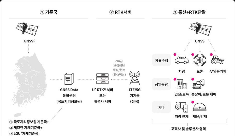 초정밀측위기술은 일반적인 GPS 등 글로벌 위성항법 시스템(Global Navigation Satellite System, GNSS)을 사용할 때 발생하는 최대 수십 미터 오차를 ‘실시간 이동 측위(Real Time Kinematic, RTK)’ 기술로 보정해 1~2cm 수준의 정확도를 가지는 위치정보 기술이다. RTK 기술의 오차 보정 정보는 기준국에서 발송하게 되는데 국내 통신사 중 가장 많은 기준국을 보유한 LG U+의 RTK 기술은 버스정보시스템(GIS), 농기계 자율주행, 스마트골프서비스, 공유모빌리티 등 다양한 산업분야에 활용되고 있다.