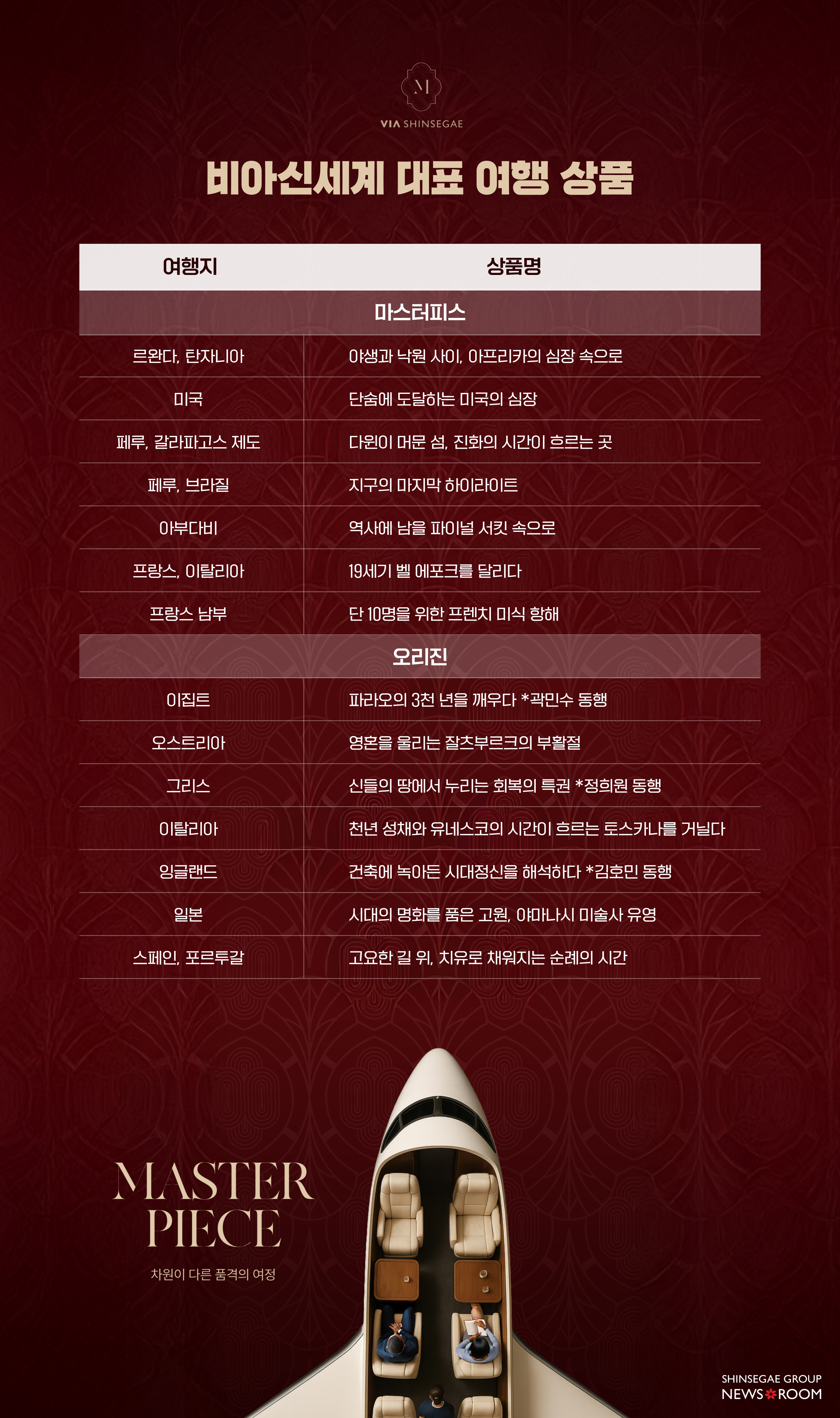① 마스터피스 : 오직 소수만이 누릴 수 있는 특별한 경험을 모았다. 북극점 크루즈, 아프리카 므넴바 아일랜드, 미국 프라이빗젯 투어 등 희소성과 상징성을 동시에 갖춘 여정으로 비아신세계에서만 떠날 수 있는 경험들이다.