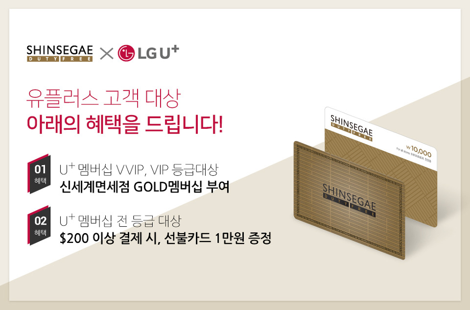 여기에 200달러 이상 오프라인 구매 고객에게는 1만원의 선불카드도 증정한다. LG유플러스 멤버십 등급이 VIP 이상인 고객에게는 신세계면세점의 GOLD 멤버십을 추가로 부여하며, 얼리버드 이벤트 참여 고객을 위한 스무디킹 음료권 증정 이벤트도 마련돼 있다.