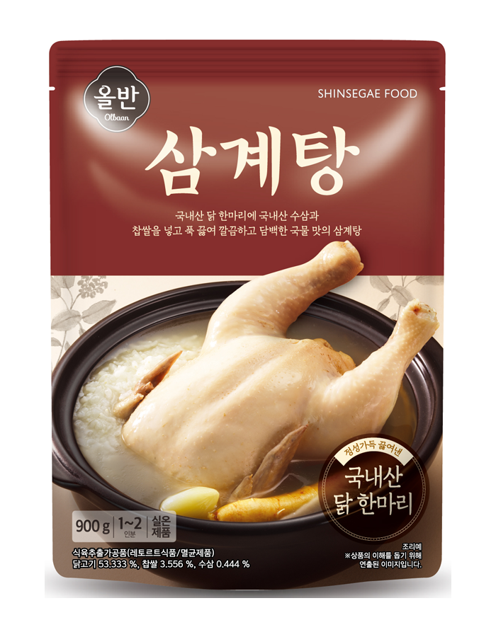 한편 신세계푸드의 ‘올반 삼계탕’은 엄선한 국내산 닭 한마리에 국내산 인삼과 찹쌀을 넣어 푹 끓이고, 기름기와 불순물을 걸러내 깔끔하고 담백한 국물 맛이 특징이다. 또한 찹쌀, 인삼, 마늘, 양파, 생강 등 5가지 국내산 농산물을 사용해 더욱 건강하게 즐길 수 있는 제품이다. 상온 간편식으로 만들어져 온라인 주문 및 장기간 실온보관이 가능하고, 끓는 물에 포장된 상태로 15분만 가열하면 돼 조리도 간편하다.