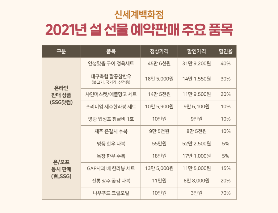 신세계백화점은 오는 1월 4일부터 24일까지 총 21일간 2021년 설 선물세트 예약 판매에 나선다. 예약 판매 품목은 배, 사과, 곶감 등 농산 40품목, 한우 등 축산 34품목, 굴비, 갈치 등 수산 30품목, 건강식품 45품목 등 지난해 설보다 21개 품목이 늘어난 총 271가지이다.