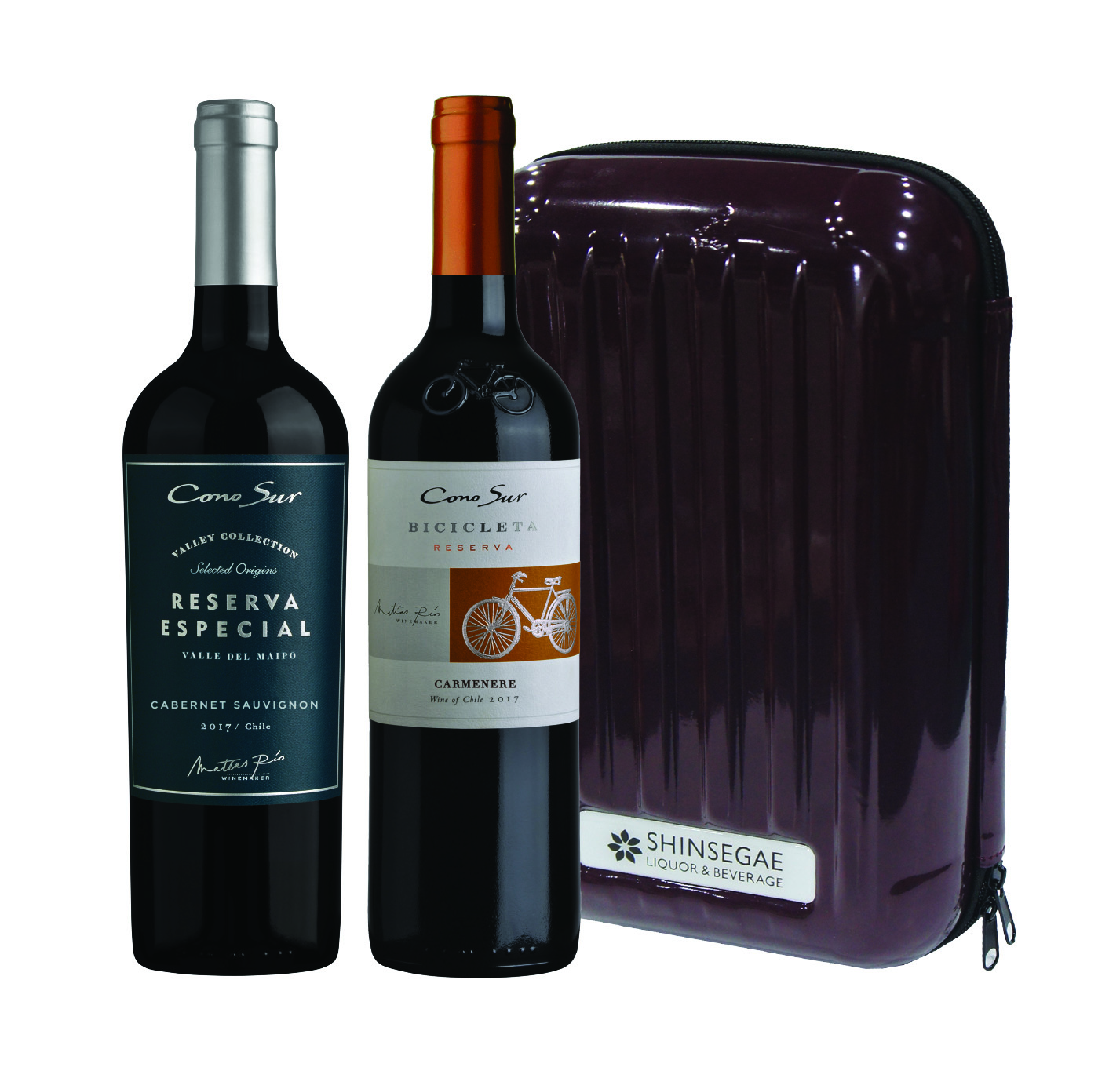 <Drink International> 선정 2015년 ‘세계에서 가장 존경 받는 와인 브랜드’ 10위에 꼽힌 코노 수르에서 만든 와인들이다. 붉은 과일 향과 오크 향이 절묘하게 어우러지는 탄닌이 입안을 감싸는 코노 수르 레세르바 에스페샬 까베르네 소비뇽과 블랙베리, 블랙체리, 레드커런트 등 검붉은 과일의 진한 풍미가 입 안에서 꽉 차는 코노 수르 비씨클레타 까르메네르로 구성했다. 또한, 다용도로 사용 가능한 캐리어 파우치에 와인을 담아 그 가치를 더했다.