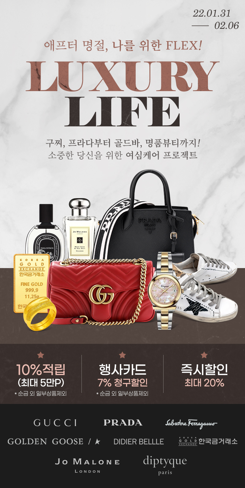 구찌/프라다/골든구스/페라가모/메종마르지엘라/MCM 등의 인기 명품 브랜드 상품과 순금 골드바와 주얼리 제품들, 조말론/딥티크/헤라/달바 등의 뷰티 카테고리 상품을 준비했다.