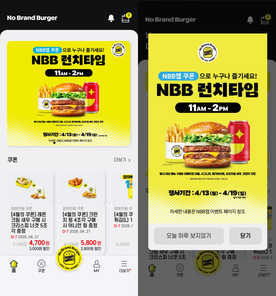 실제 노브랜드 버거는 자체 앱을 통해 실질적인 고객 혜택을 제공하고 있다. 브랜드 슬로건 ‘Why pay more?(왜 더 내?)’에 맞춰 앱 이용자들에게 세트업 등 정기적으로 특별한 혜택을 제공하는 ‘와페모 페스티벌(Why pay more Festival)’과 점심 시간 노브랜드 버거의 대표 메뉴를 부담 없는 가격에 즐길 수 있도록 마련한 ‘NBB 런치타임’ 등을 진행하며 고객들이 일상적으로 가성비를 체감할 수 있도록 하고 있다. 이외에도 ‘사이드 메뉴 증정’, ‘세트업’, ‘1+1’, ‘생일 쿠폰’ 등 다양한 앱 쿠폰을 정기적으로 제공하고 있다.