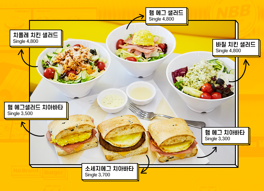 노브랜드 버거가 역삼역점에서 처음으로 선보인 신메뉴. 상단 샐러드 3종과 하단 모닝메뉴 3종.