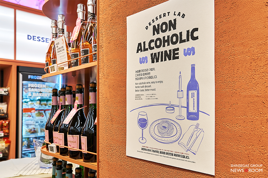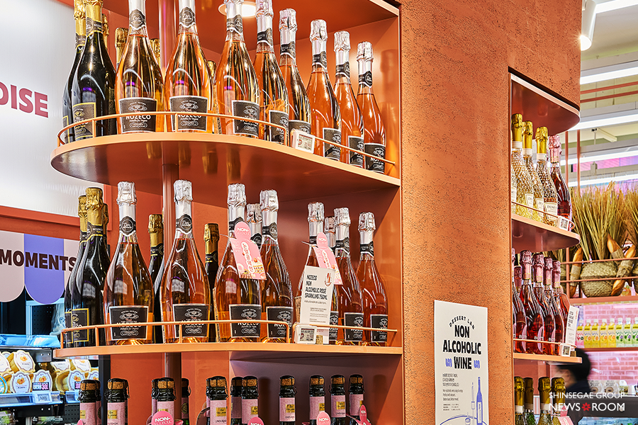 매장 중앙으로 걸음을 넘기면 와인 페어링존이 등장합니다. 일반적인 편의점 와인 코너와는 결이 다릅니다. 달콤한 디저트와 찰떡궁합을 자랑하는 논알코올 와인들을 큐레이션 했죠. 가벼운 와인 한 병과 디저트를 챙겨 근처 서울숲으로 피크닉을 떠나는 상상만으로도 행복해집니다.