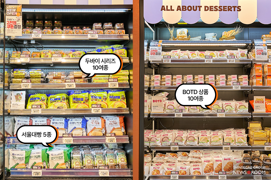 사람들의 발길이 가장 먼저 멈춘 곳은 역시 ‘디저트존’입니다. 두바이 시리즈, 서울대 빵, 빵튜버 ‘뽀니’와의 협업디저트 등 이마트24에서만 판매하는 특화 디저트들이 가득합니다.