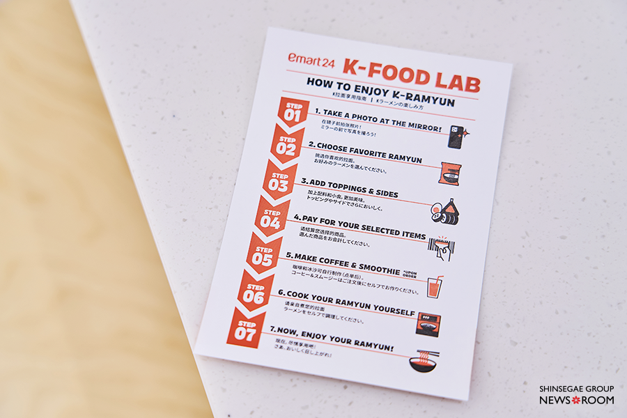 이곳의 백미는 ‘체험’입니다. 수많은 라면 앞에서 결정 장애가 올 법도 하지만, 이마트24는 친절한 가이드를 구비해 두었습니다. 외국인들을 배려해 맵기를 4단계로 나누고 이를 안내 카드로 표시했죠. 영어, 중국어, 일본어로 K-라면을 즐기는 방법도 소개해 외국인 관광객들의 편의를 더욱 높였습니다.