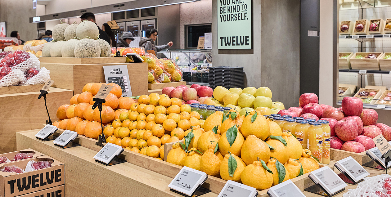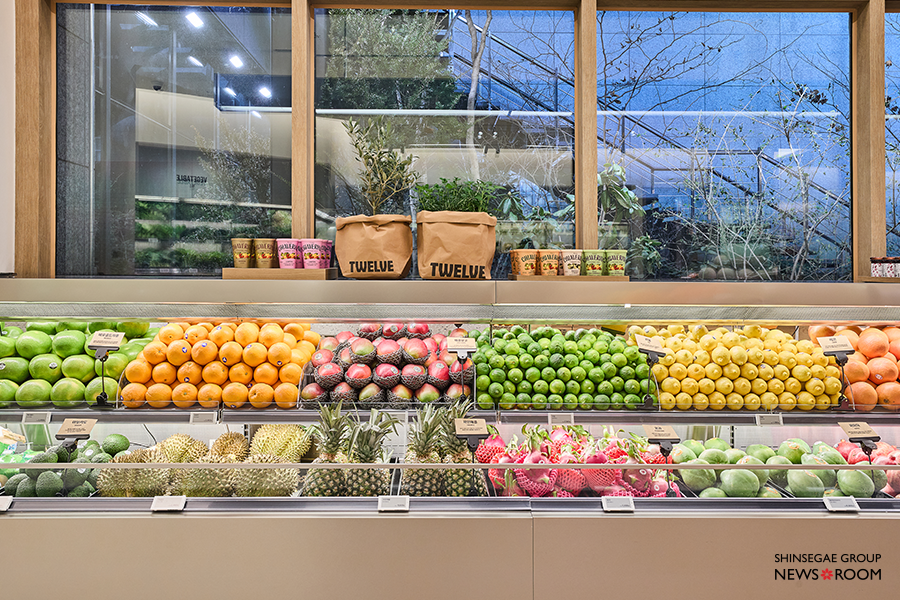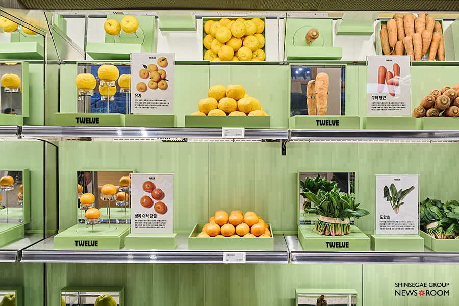 지하 1층의 ‘트웰브(TWELVE)’는 ‘패션 매거진 같은 식품관’을 표방한다. 가장 큰 특징은 진열 방식이다. 마치 의류 매장에 디스플레이된 상품처럼, 레몬과 당근, 포항초 같은 식재료가 한 점씩 쇼케이스에 놓였다. 상품의 정보보다 색, 질감, 계절감이 한눈에 들어오며 ‘이 재료로 뭘 해볼까’라는 생각이 자연스럽게 따라온다.