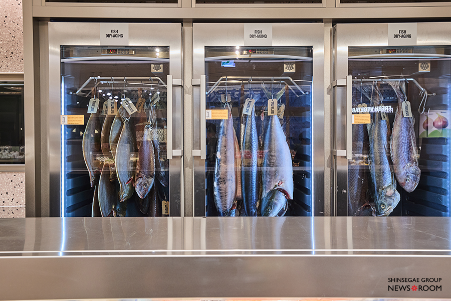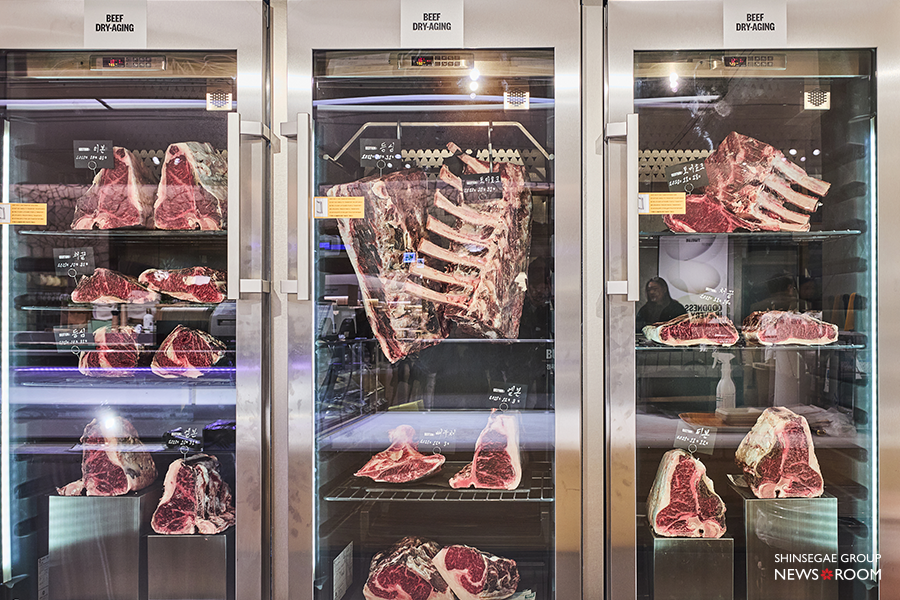 전문 드라이에이징 장비로 숙성한 육류와 수산물도 이 공간의 인상을 또렷하게 만든다. 유리창 너머로 큼직한 한우 부위와 생선이 그대로 걸려 있고, 숙성 과정이 그대로 전시된다. 상품을 고르는 순간까지 ‘과정’이 보이도록 설계한 점이 인상적이다.