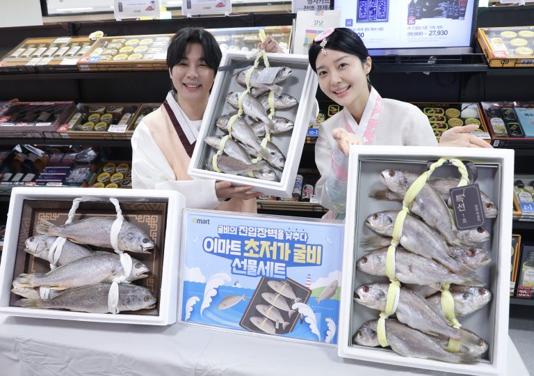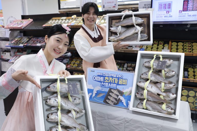 이마트 용산점에서 모델들이 ‘가성비 굴비 선물세트’를 소개하고 있다. 이마트는 설 선물세트 사전예약기간인 2/6(금)까지 ‘수조기 굴비세트(1.8kg, 5미)’를 59,850원에 판매한다. 해당 상품은 2025년 9~12월에 어획한 수조기를 사용한 ‘햇 굴비’로, 사이즈가 크다는 점이 특징이다. 동일한 크기의 참조기 굴비와 비교하면 가격은 10% 이하 수준으로,