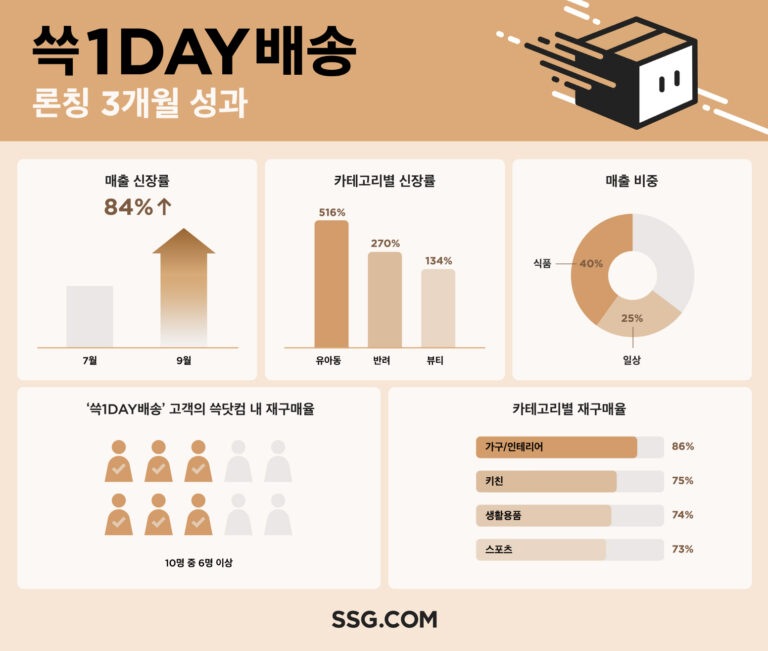 SSG닷컴이 자체 익일배송 서비스 ‘쓱1DAY(원데이) 배송’ 성과를 공개했다. 라이프스타일 상품 매출이 크게 증가하면서 식료품 비중이 높은 시간대 지정 ‘쓱배송’, ‘새벽배송’과 상승효과를 내고 있는 것으로 나타났다.