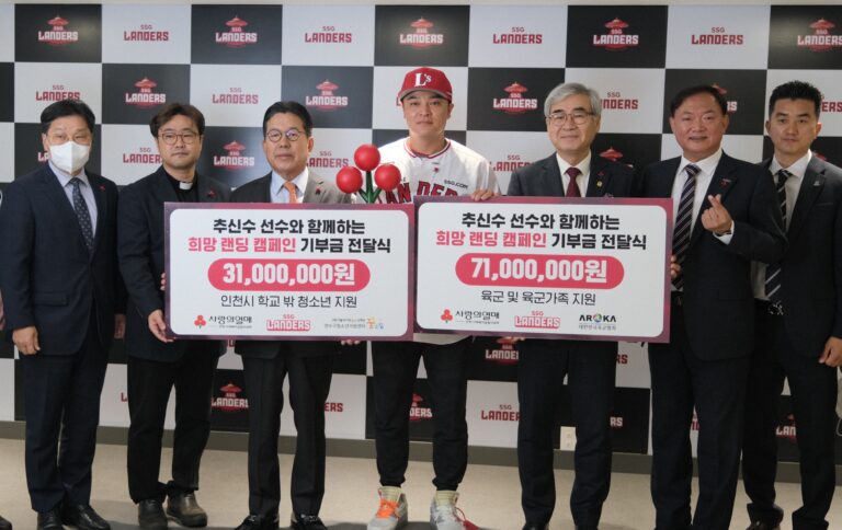 SSG랜더스의 추신수 선수가 ‘희망 랜딩’ 캠페인을 통해 적립한 기부금 총 1억 2백만 원을 취약계층 군인들과 인천시 학교 밖 청소년들에게 전달했다.