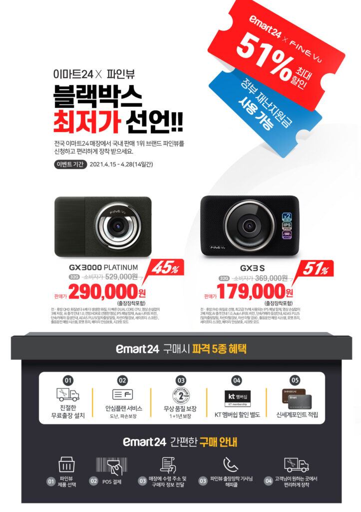 이마트24는 파인뷰와 손잡고 이달 15일(목, 오늘) 11시부터 27일(화) 10시까지 파인뷰 블랙박스 2종을 온라인 판매가격 대비 절반 수준으로 예약판매한다.