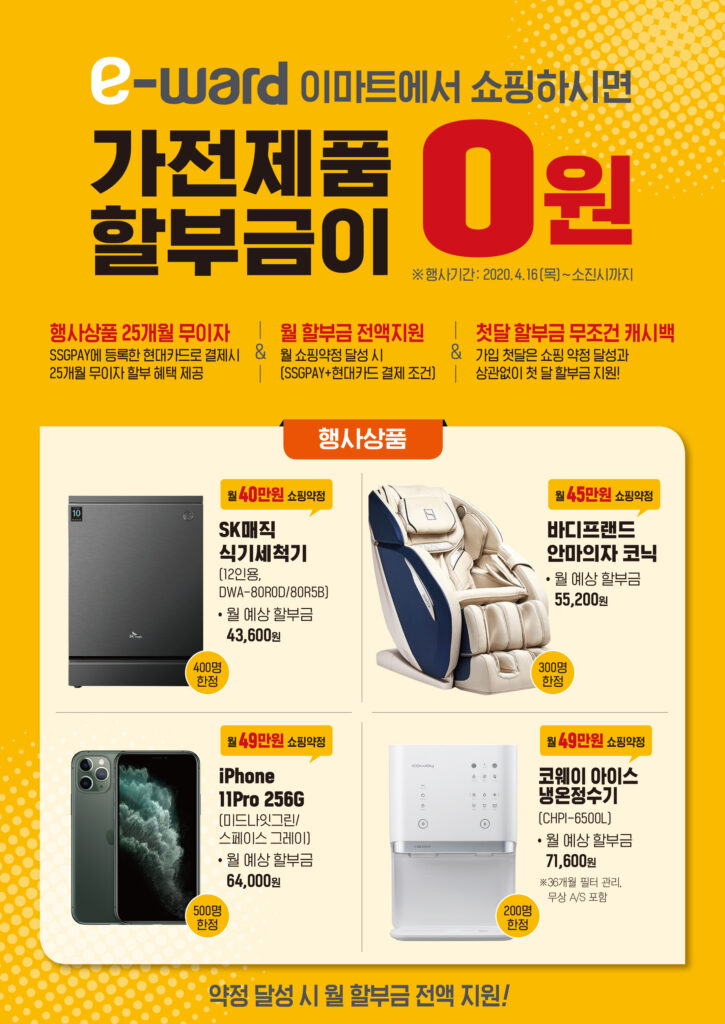 이마트가 오프라인 매장을 위한 집객 프로그램으로 ‘e-ward’ 캐시백 3차 프로모션을 시작하며 우수고객을 또 한번 꽉 붙든다. 이마트는 총 1400명을 대상으로인기가전 4종을 저렴하게 장만할 수 있는 기회를 마련했다.