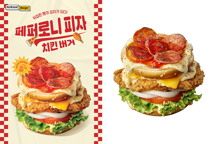 노브랜드 버거의 ‘페퍼로니피자 치킨’은 바삭한 치킨패티에 특제소스를 넣어 만든 버거 위에 번(Bun, 버거용 빵)을 반대로 뒤집은 뒤 페퍼로니, 토마토 소스, 치즈 등을 얹어 마치 페퍼로니 피자를 연상케 하는 이색적인 비주얼이 특징인 버거다.